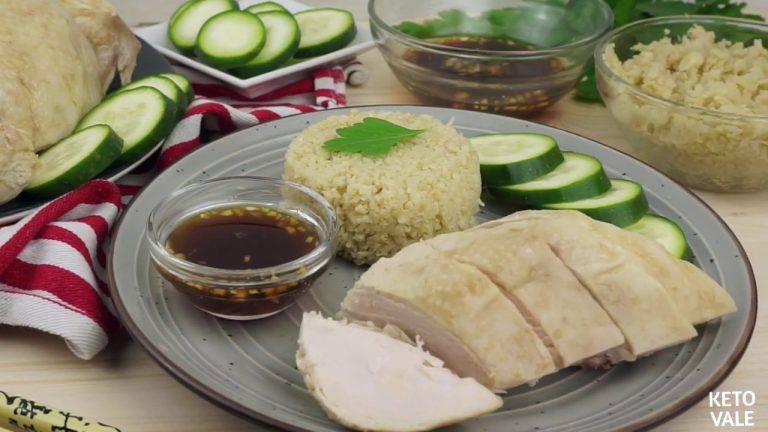Nasi Ayam Hainan klasik yang disesuaikan untuk penggemar keto. Hidangan ini menggandingkan ayam rebus yang lembut dengan nasi kembang kol aromatik, semuanya ditambah dengan sos pencicah amino kelapa yang masam. Tambah hirisan timun segar untuk kontras yang menyegarkan.