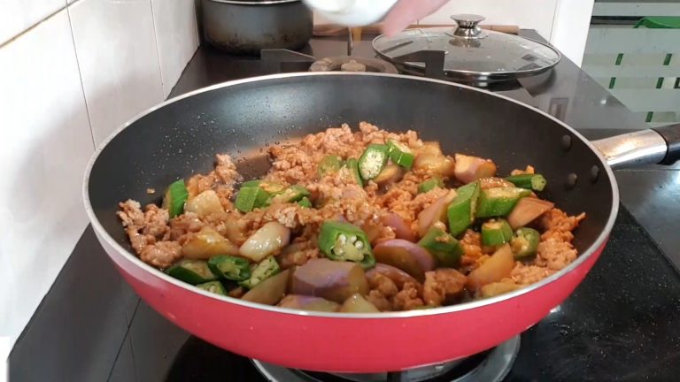 Tumis cepat dan mudah ini menggabungkan rasa bendi dan terung dengan daging babi cincang untuk hidangan satu hidangan. Ia sesuai untuk mereka yang mengamalkan diet rendah karbohidrat dan boleh dihidangkan bersama nasi konjac. Anda juga boleh menggantikan daging babi cincang dengan daging lembu atau ayam.